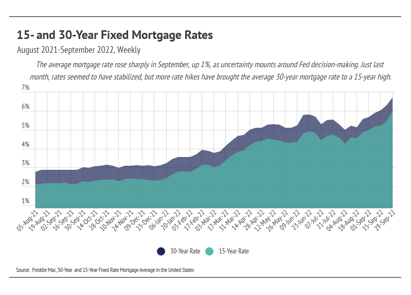 The Fed provided huge incentives to buy homes as part of its easy monetary policy during the pandemic by purchasing Mortgage-Backed Securities (MBS) and dropping interest rates. MBS play an integral role in home financing by allowing banks to bundle and sell mortgage loans, thereby turning the bank into an intermediary between the financier and financial markets (investors). Banks get some fees, and investors, rather than the bank, get the interest from the bundle of mortgages, so in many ways, the bank facilitates the loan but investors are the ones really lending the buyer the money. The Fed was a huge investor in 2020 and 2021, doubling its MBS holdings to $2.7 trillion. However, the Fed isn’t buying any more MBS and, in fact, would like to sell — but can’t do so without taking huge losses. Additionally, mortgage rates have jumped dramatically in 2022, more than doubling, which shines a light on just how unique 2021 was for homebuying.